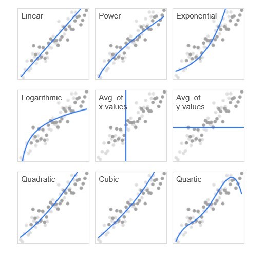 In the scatter chart, trendlines based on a power law, exponential or logarithmic relationship can be fitted to your data (see 12.4.1 Trendline).