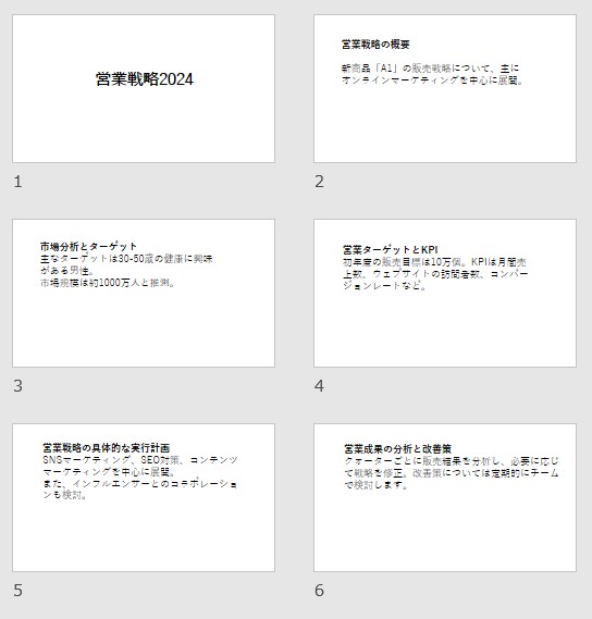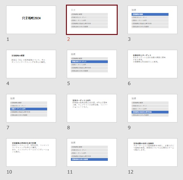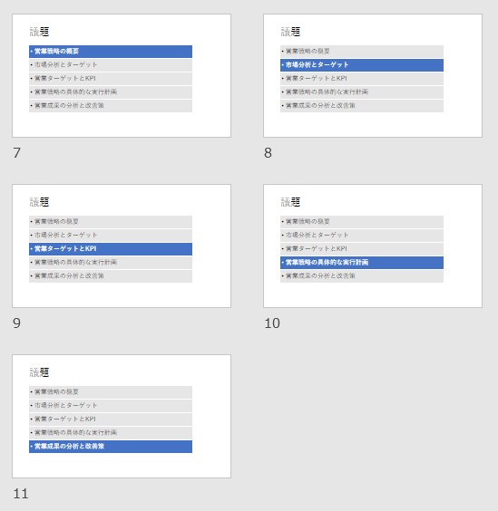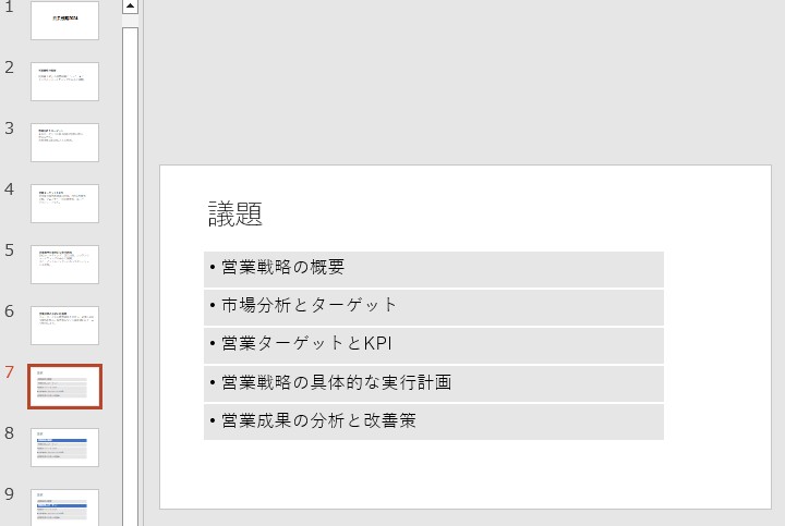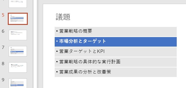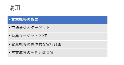 think-cell なら柔軟なアジェンダスライドが簡単に作れます。たとえば以下のような資料のアジェンダを作り、パワポスライドにアジェンダスライドを作成してみましょう。今回は営業戦略のアジェンダとして、下記の内容の資料を作成している場面と想定します。