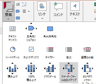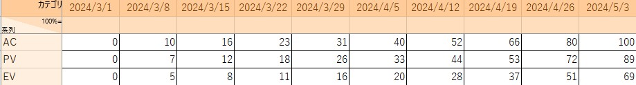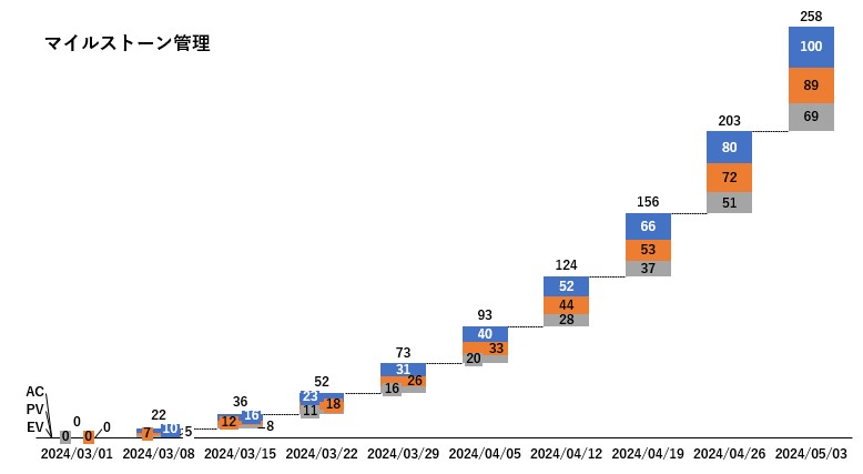 ウォーターフォールチャートは、プロジェクトのマイルストーン管理にも使われます。各マイルストーンをウォーターフォールチャートに反映させることで、プロジェクトの進捗状況や重要なマイルストーンの達成度を視覚的に確認することができます。パワポのthink-cellメニューの要素からウォーターフォールのビルドアップを挿入し、そのデータシート上で、系列にコスト実測値ACを、出来高計画値PVを、出来高実績値EVを入力し、カテゴリに日付を入力します。