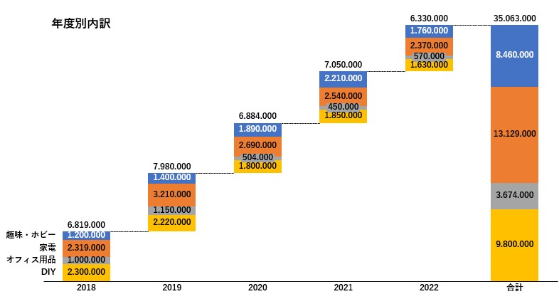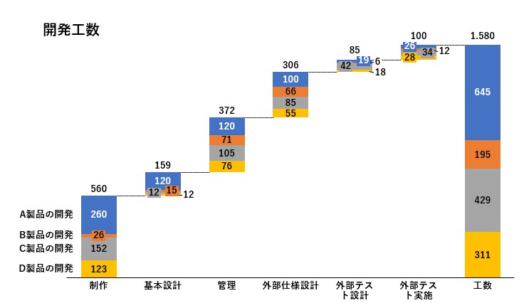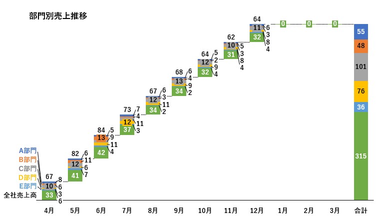 今回は、そのウォータフォールチャート内に積み上げグラフの要素が入っているようなパターンを事例として紹介していきます。