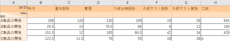 制作、管理、テストといった項目ごと、4製品別で工数を管理し、合計工数をウォーターフォールチャートで表示した場合です。PowerPointを立ち上げて、think-cellメニューの要素からウォーターフォールのビルドアップを選びます。