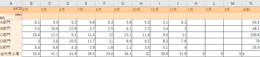 ウォーターフォールチャートを使って部門や支店別の売上高を月ごとの区切りなどで比較することで、売上高の推移を細かく分析することができます。こうすることでどの要素が収益に寄与しているのか、また売上高に対する貢献度を視覚的に理解することができます。こちらも実際に作ってみましょう。PowerPointを立ち上げて、think-cellメニューの要素からウォーターフォールのビルドアップを挿入します。開かれたデータシートに系列に部門名を、カテゴリに月を入力します。各部門の売上高を入力します。合計部分にeを入力してください。