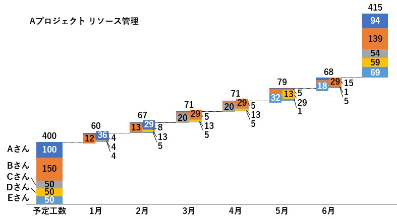ウォーターフォールチャートは、プロジェクトのリソースの使用状況を把握するためにも活用されます。リソースの予算や時間の割り当てを積み上げ式に反映させることで、どのリソースがどのタスクに割り当てられているのかを一目で確認することができます。ではリソース管理のための積み上げグラフを作ってみましょう。パワポのthink-cellメニューの要素からウォーターフォールのビルドアップを挿入し、そのデータシート上で、系列には担当者名、カテゴリには予定工数、月別の実数を入力します。