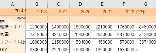 ウォーターフォールチャートを使って売上の確認を視覚的に行うことができます。例えば、製品やサービスの売上を月ごとにウォーターフォールチャートに反映させることで、売上の変化やトレンドを視覚的に把握することができます。ホームセンターでのカテゴリー別売上推移グラフをウォーターフォールチャートで作ってみましょう。パワポのthink-cellメニューの要素からウォーターフォールのビルドアップを挿入し、そのデータシート上で、系列に商品カテゴリを、カテゴリに年度を入力し、数値を入れます。
