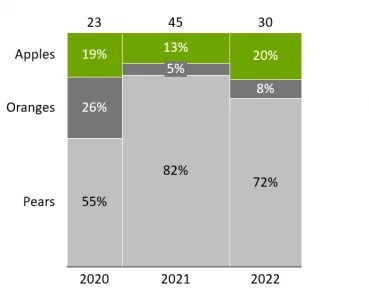 一方、一部を強調すれば「このグラフは21年から22年に伸びたことを伝えたい」ということが読み手にわかります。think-cellはこうしたグラフの本質を理解して、グラフの強調をサポートしてくれます。