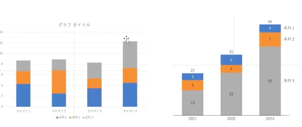 図のように、PowerPointでグラフを単に作成しただけだと、青色のセグメントが増えたことを伝えたいのか、緑色のセグメントが減ったあと急激に伸びたことを伝えたいのかがわかりません。