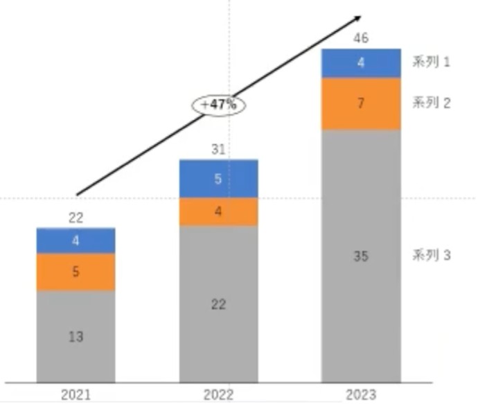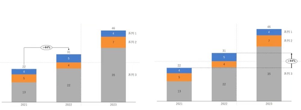 もしかしたら、こうした凡例や合計値、矢印、成長率などをグラフに追加する必要はないと考える人がいるかもしれませんが、グラフでは、伝えたいことを強調することがとても重要なのです。