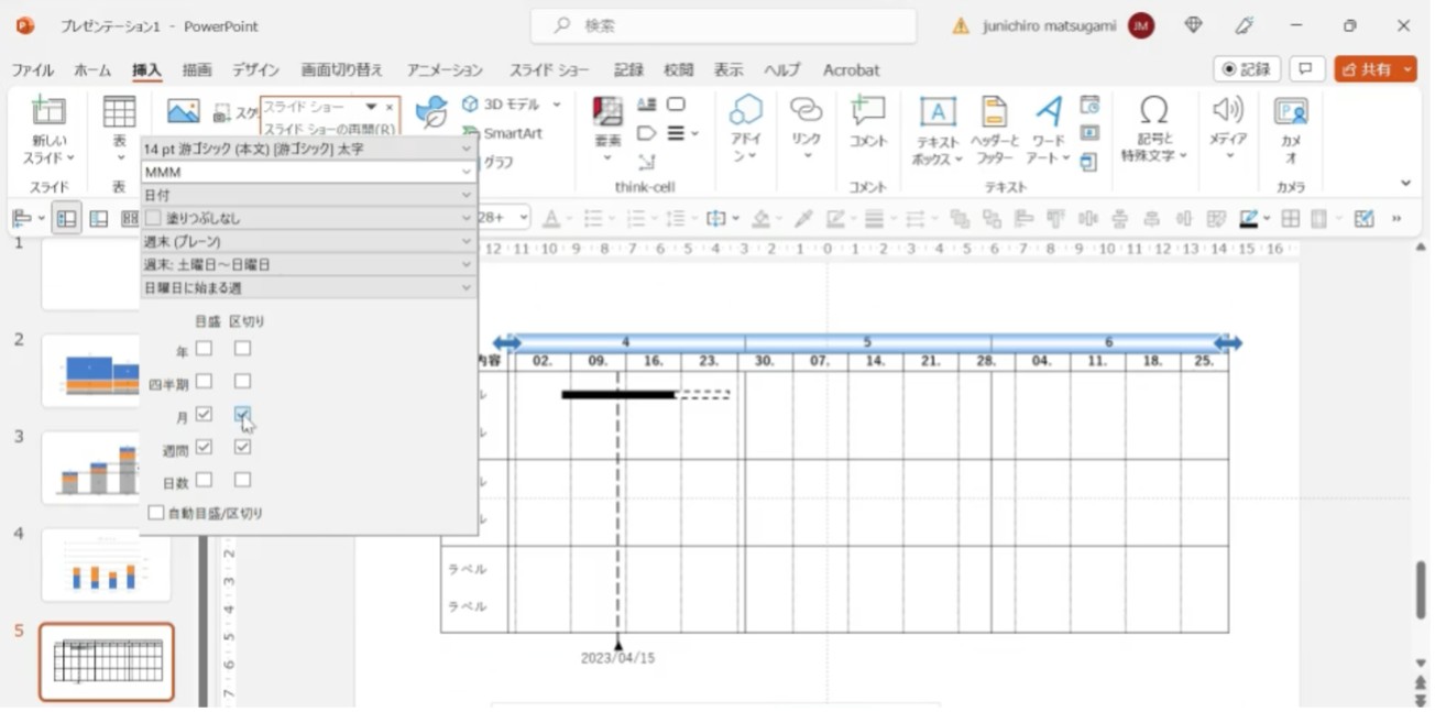 さらに、think-cellの機能でもう1つ便利なのが「ガントチャート」の作成機能です。通常ガントチャートはExcelで作成・管理するケースが多いので、なぜPowerPointでガントチャートを作成する必要があるのか不思議に思う人もいるでしょう。それは、コミュニケーションを目的としているからです。たとえExcelより粒度が粗くても、「何月までにこのような工程が進む」ことを主眼に相手に伝えたいときなどに利用します。