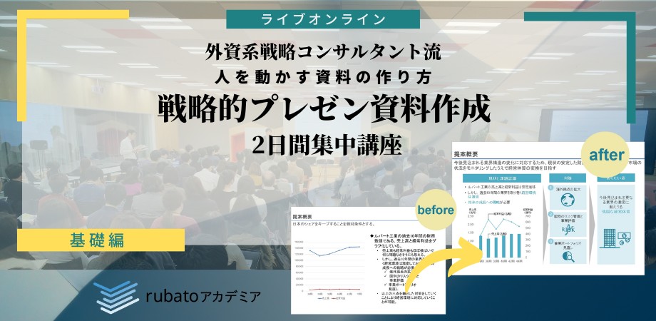 ここまでPowerPointでの資料作成のヒントと、think-cellの活用について紹介してきました。また、私が代表取締役を務める株式会社Rubatoでは、ビジネス研修やコーチングをメインサービスとして提供しています。個人向け&法人向けのさまざまなプログラムを展開していますが、その中でも提供開始から13年目を迎えるのが「戦略的プレゼン資料作成講座 2日間集中講義」です。これまで1,800人以上に受講いただき、満足度も96%以上と高い当社の看板講座で、新規開発の商品やソリューションを販売される営業職の方や、社内で新規企画を提案される企画職の方など、「まだ形になっていないもの」を説明して理解してもらわなければならない方に多く受講してもらっています。