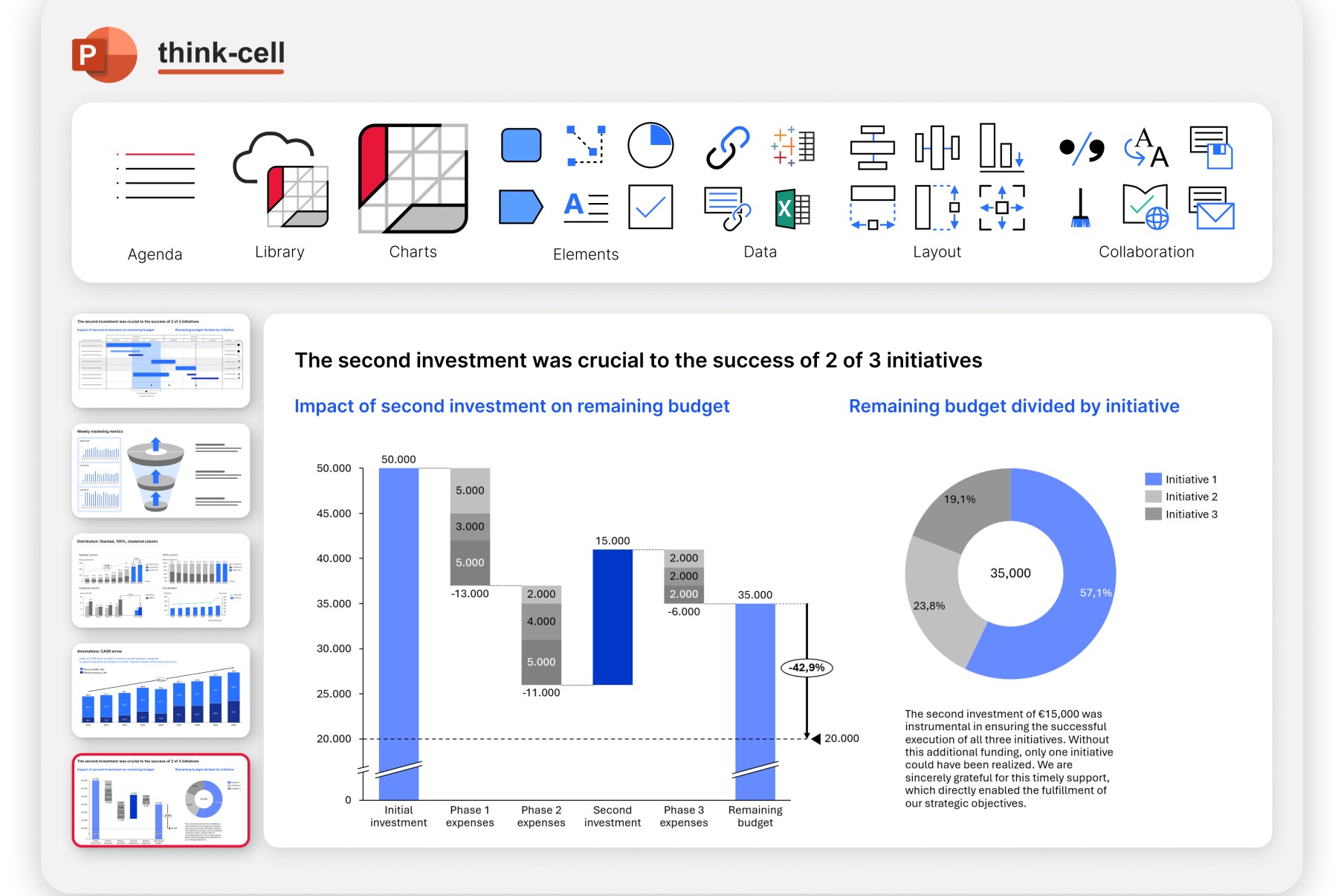 think-cell’s smart features boost productivity by eliminating manual formatting and cutting chart creation time to minutes.