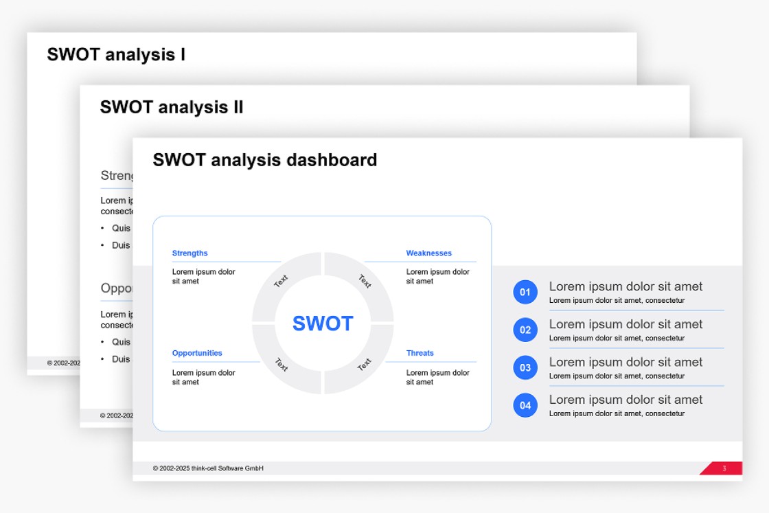 Every project is unique with different topics and contexts that I want to present as clearly as possible. The think-cell Library gives me templates to choose from in order to create a good balance between text and visualization elements that will convey my message.