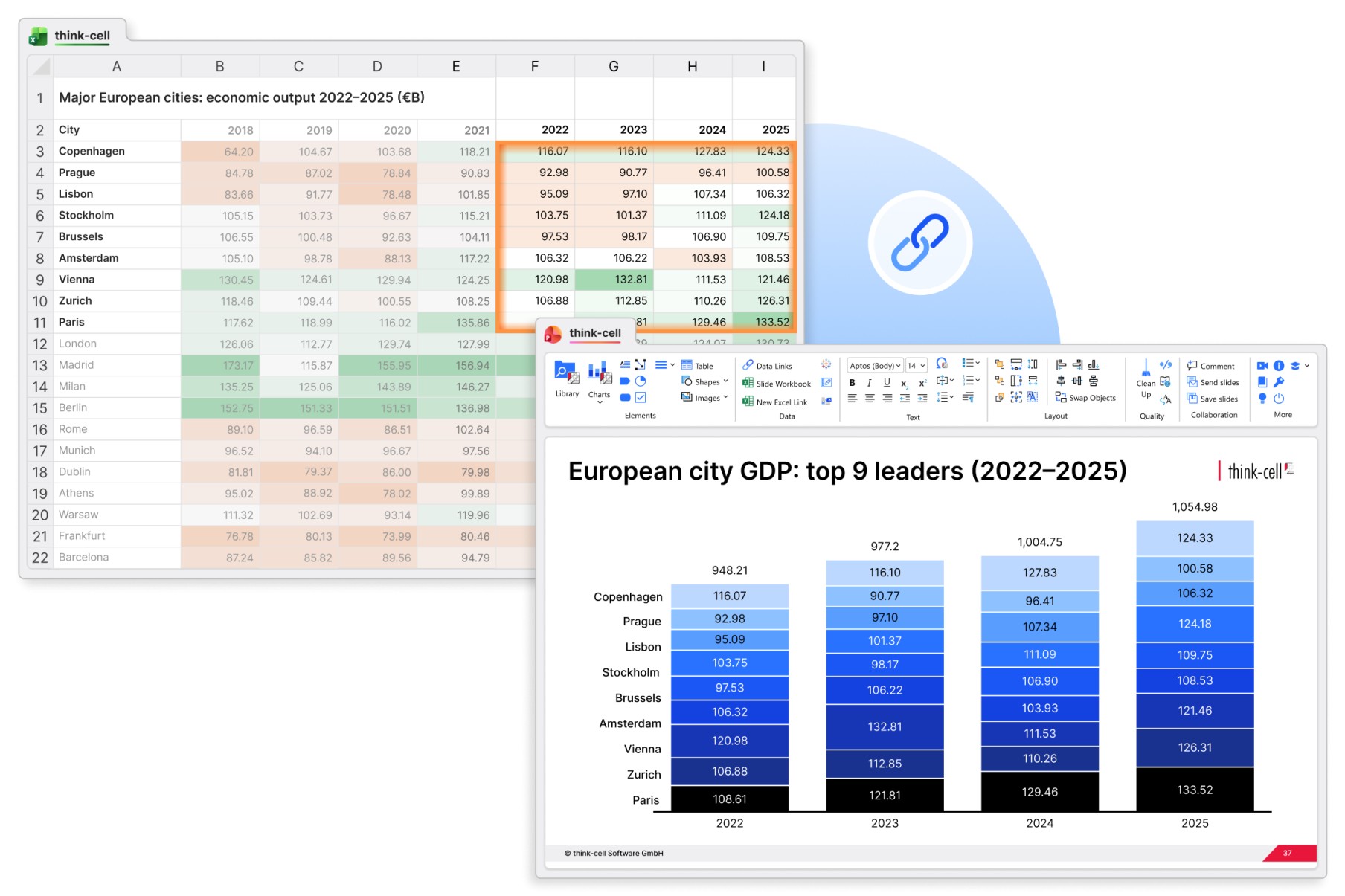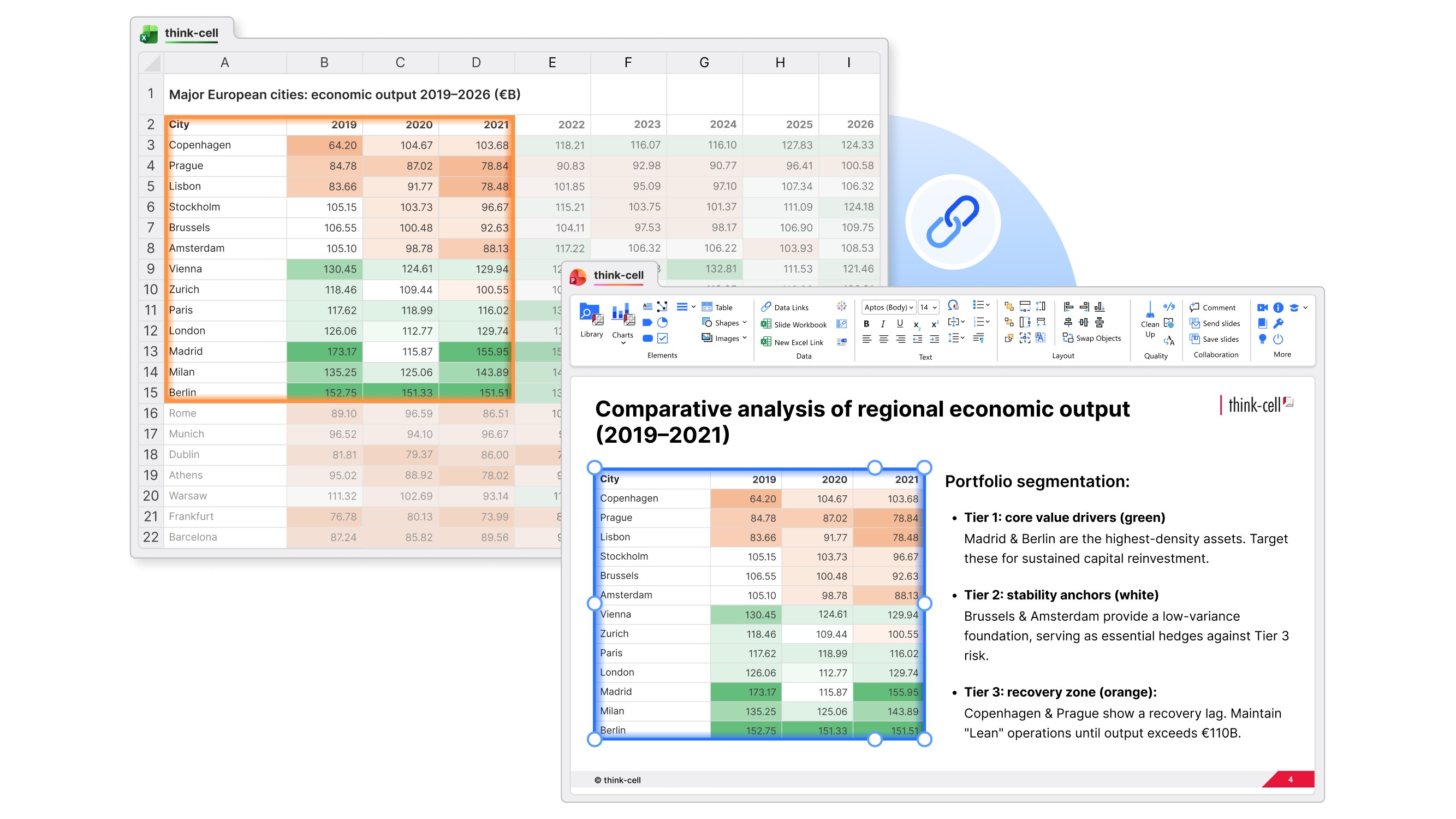 We automate our reports by establishing links not just to chart data ranges, but to every single cell that contains a value. In this way, think-cell’s Excel links helps us generate our reports faster, while also guaranteeing 100% accuracy.