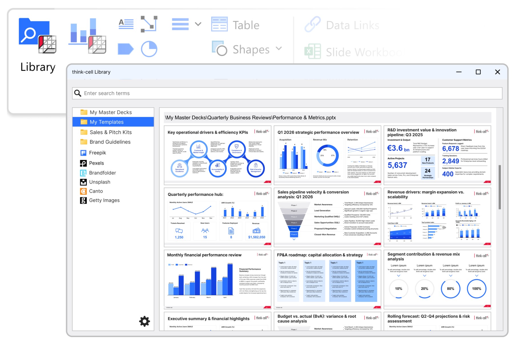 You've built hundreds of slides. So has your team. think-cell Library makes them searchable, so you spend less time redoing work that already exists.