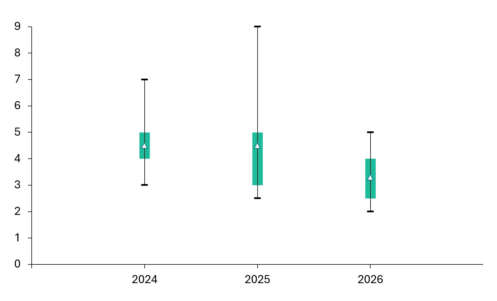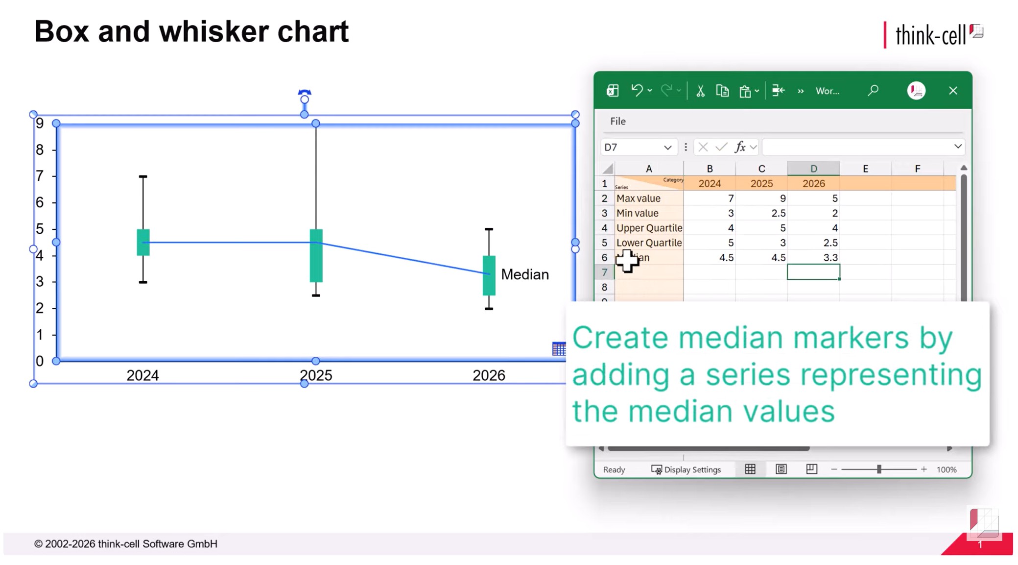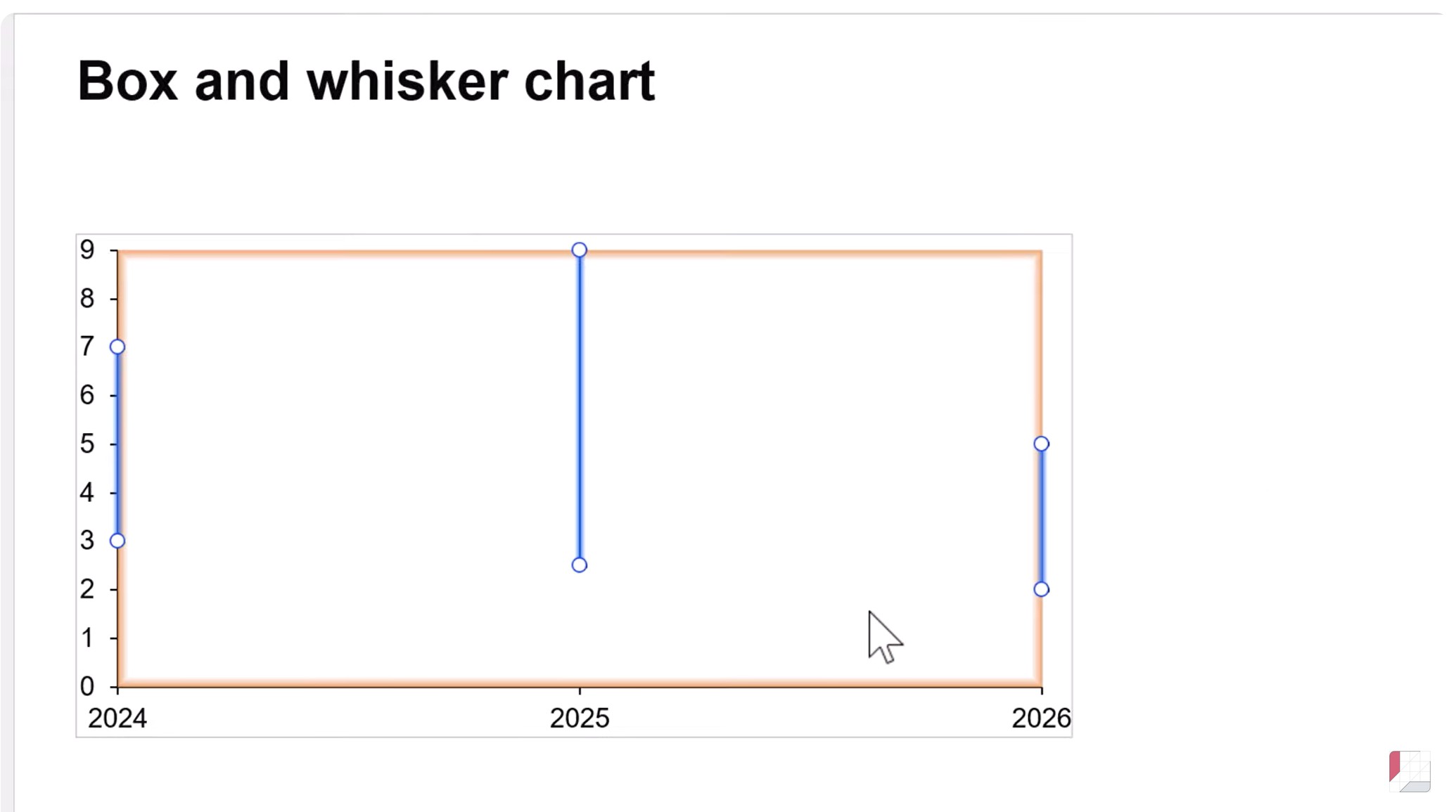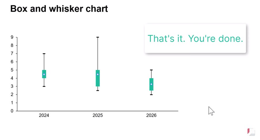 In this article we will create a box and whisker chart showing illustrative data for a three-year period, including one box plot for each of 2024, 2025 and 2026. Here’s what the box and whisker chart will look like when we’re done.