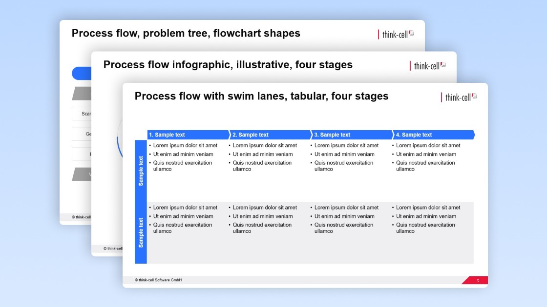 A well-designed process flow slide can be a powerful tool in helping stakeholders understand a complex process, but your whole presentation will only succeed if every slide is consistent, on-brand, and impactful. You can download think-cell’s ultimate slide toolkit to access more than 70 templates that can be used and combined in a wide range of common business scenarios.