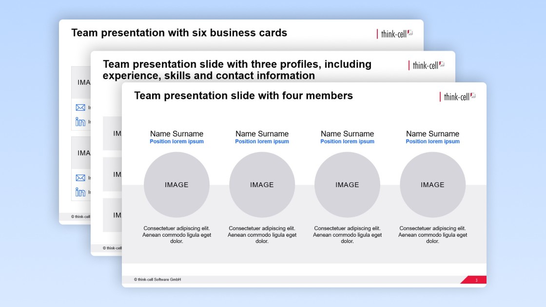 Introducing your team with clear, relevant information is an important part of many business presentations, but it will normally only be one slide of many. Your presentation will only be successful if all of your slides are slick, consistent and on-brand. With think-cell’s ultimate slide toolkit, we provide you with more than 70 templates you can use to build complete presentations for a wide range of business scenarios.