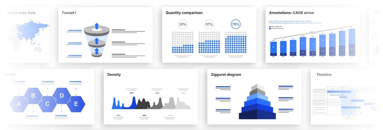 - Imagery: A pool of stock images or illustrations can guide employees in the style of imagery to choose when making presentations.