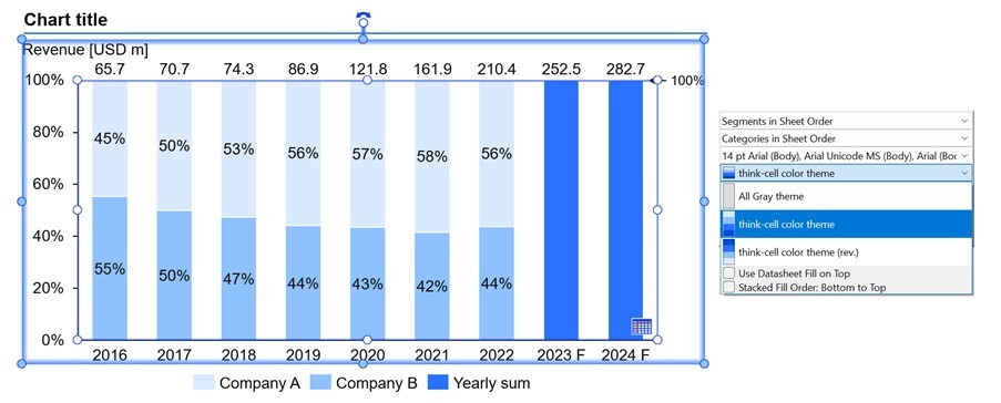 When someone inserts a slide from the think-cell Library into their presentation, they can choose to automatically adapt the slide to the presentation’s theme, ensuring brand compliance. Colors, typography, and formatting stay consistent throughout the presentation, even if slides are being pulled together from different sources.