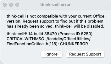 When you open PowerPoint or Excel, or when you insert or edit a think-cell chart, an error message appears that mentions "CFindCodePattern failed" or "CModuleFindChunk failed." This error typically appears after an update for Microsoft Office has been installed.