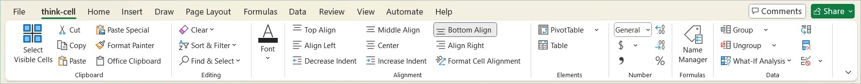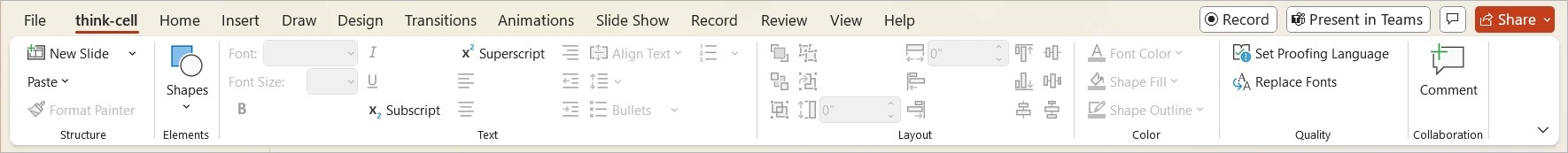 - Go to the Insert tab. If you see the think-cell group, select Tools