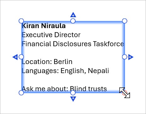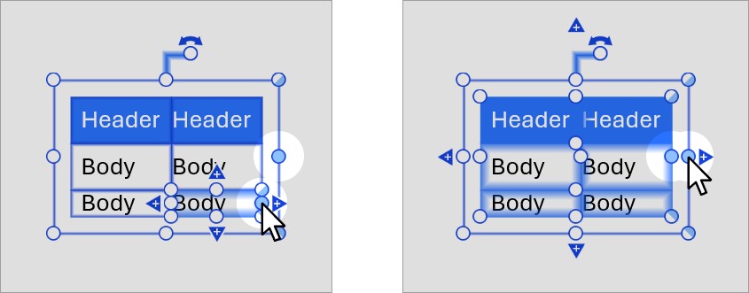 An unlocked edge can automatically move to preserve a dynamic alignment or fit the contents of a text box, table, or chart. An unlocked edge has a blue resize handle