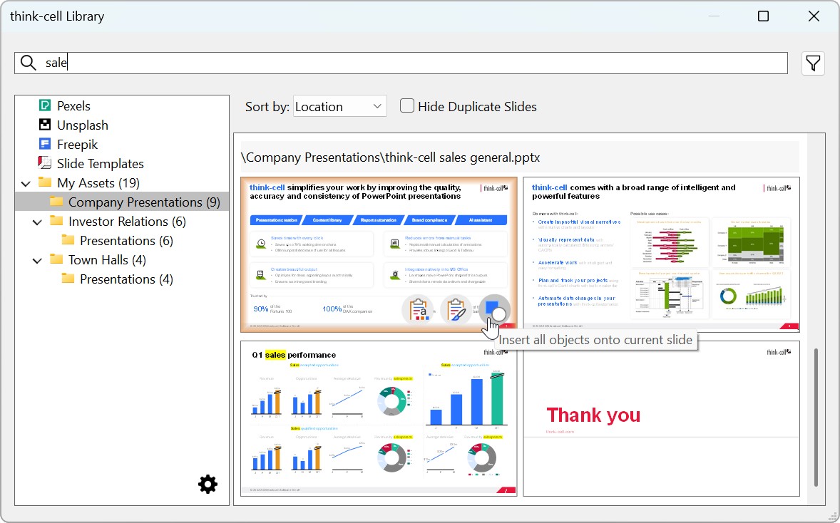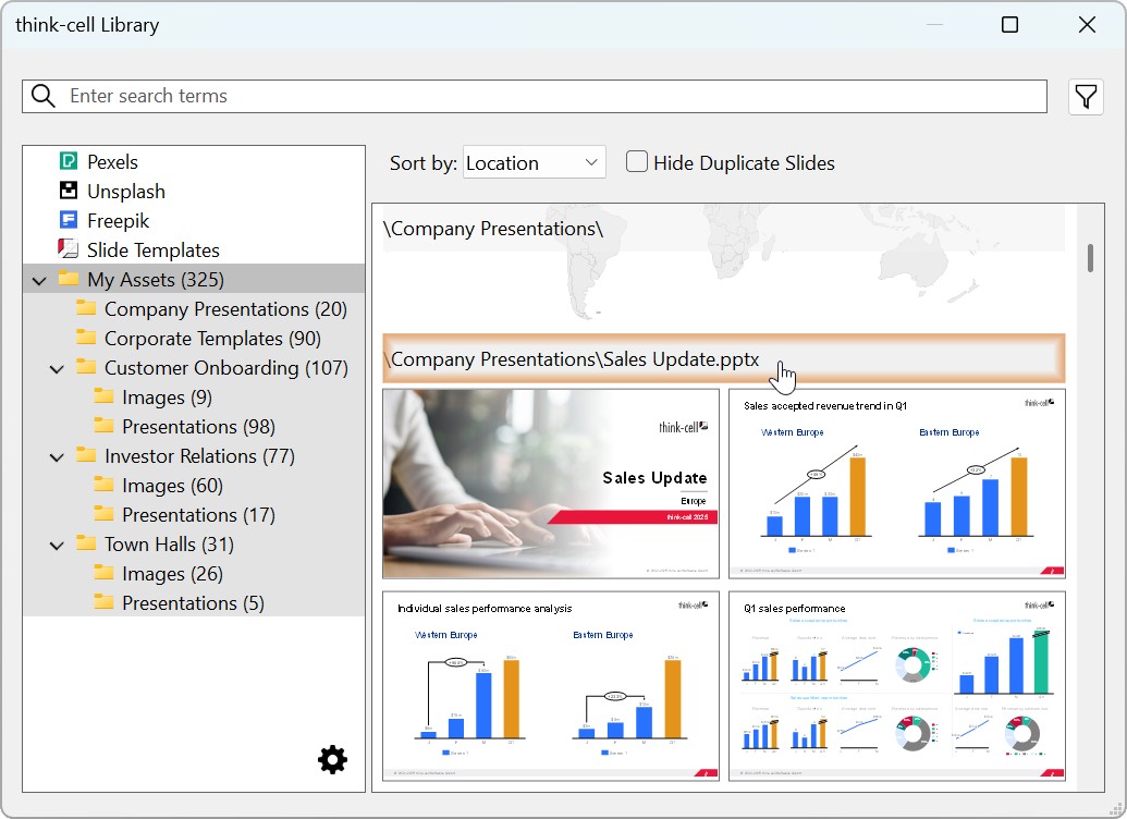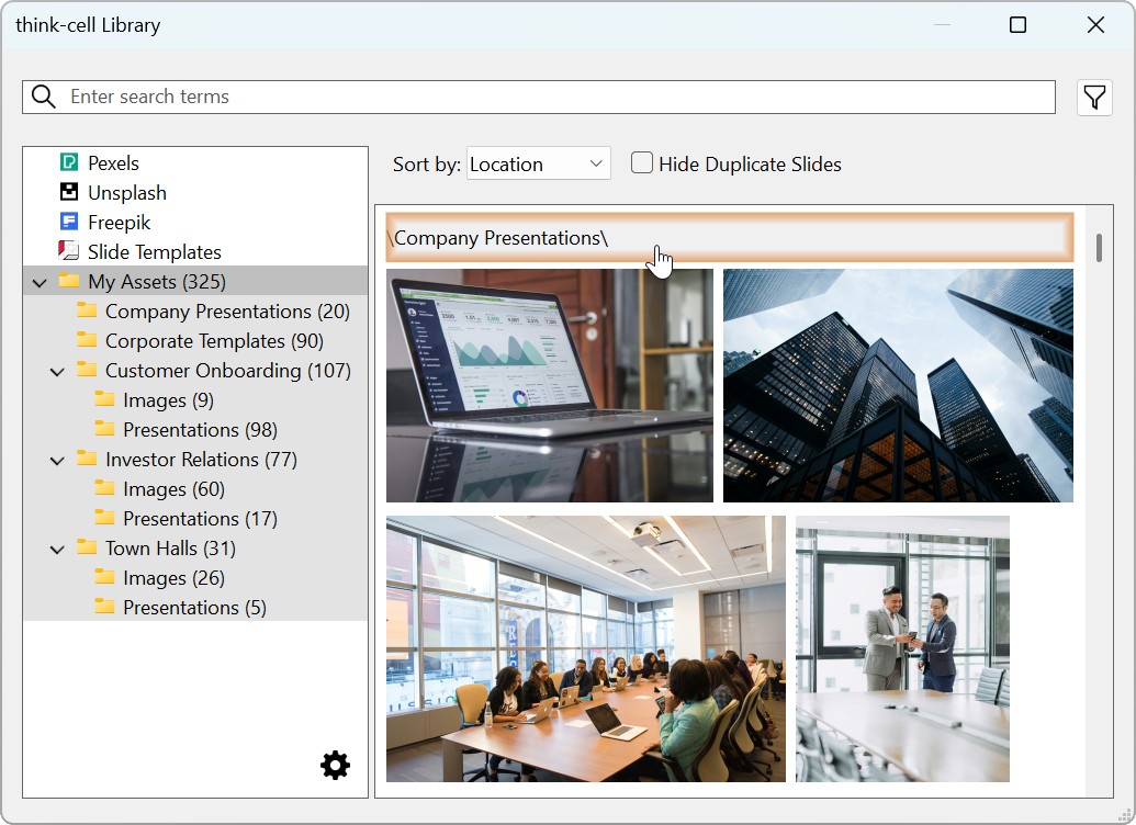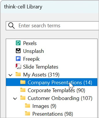 - In think-cell Library, select a folder that contains your slide assets. To add slide assets to the library, see Add your slide and image assets to the library.