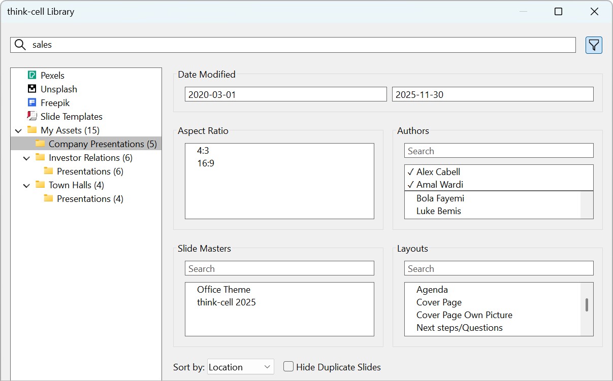 When searching your slide assets, you can filter your search results, choose how to sort the results, and hide duplicate slides.