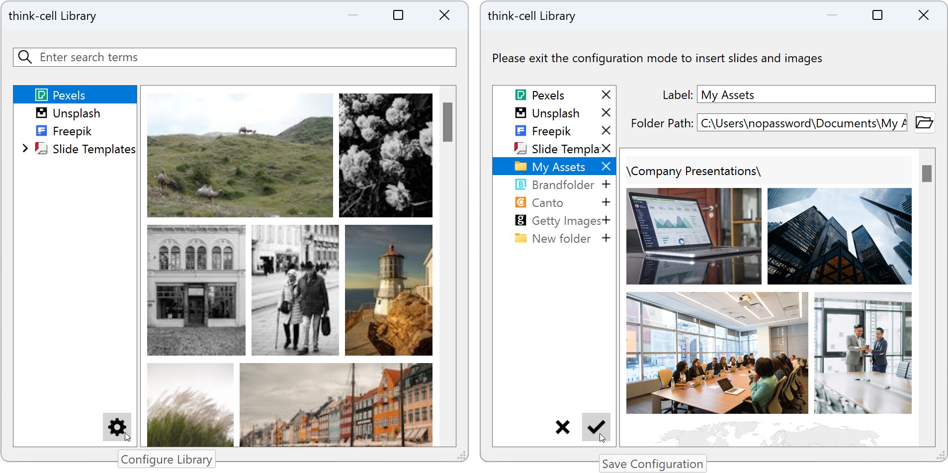 You can add folders that contain slides and images to the think-cell Library. The folders can be on your local computer, network drives, SharePoint, or OneDrive. It's easier and faster to find your assets in the library than in your file manager.