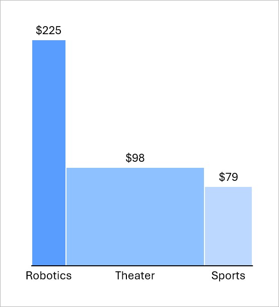 Mekko charts with units show absolute differences across categories. For example, you can compare a school's annual spend on each extracurricular activity per student. In this chart, a column area represents the total spend on an activity.