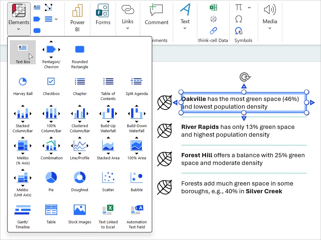To add a think-cell element to your presentation, on the PowerPoint ribbon, go to Insert > think-cell. On the Elements menu, select the element that you want.