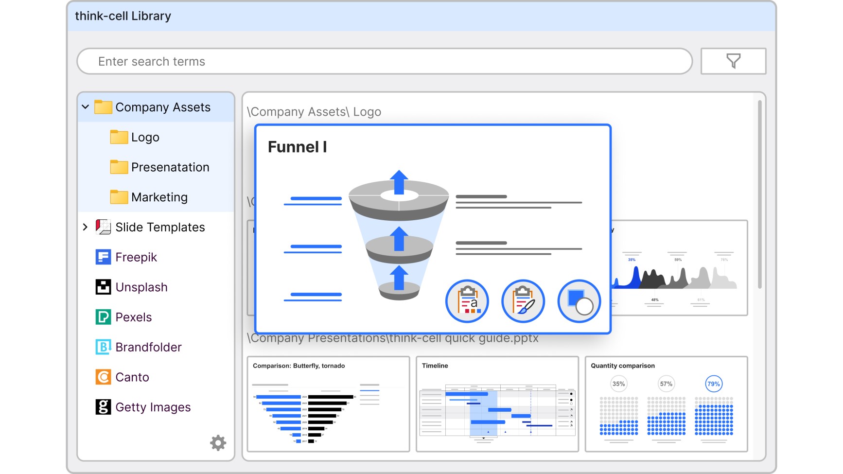 think-cell Library permite añadir sus presentaciones, diapositivas, plantillas, imágenes e iconos favoritos, poniendo todo lo que necesita justo donde lo necesita.