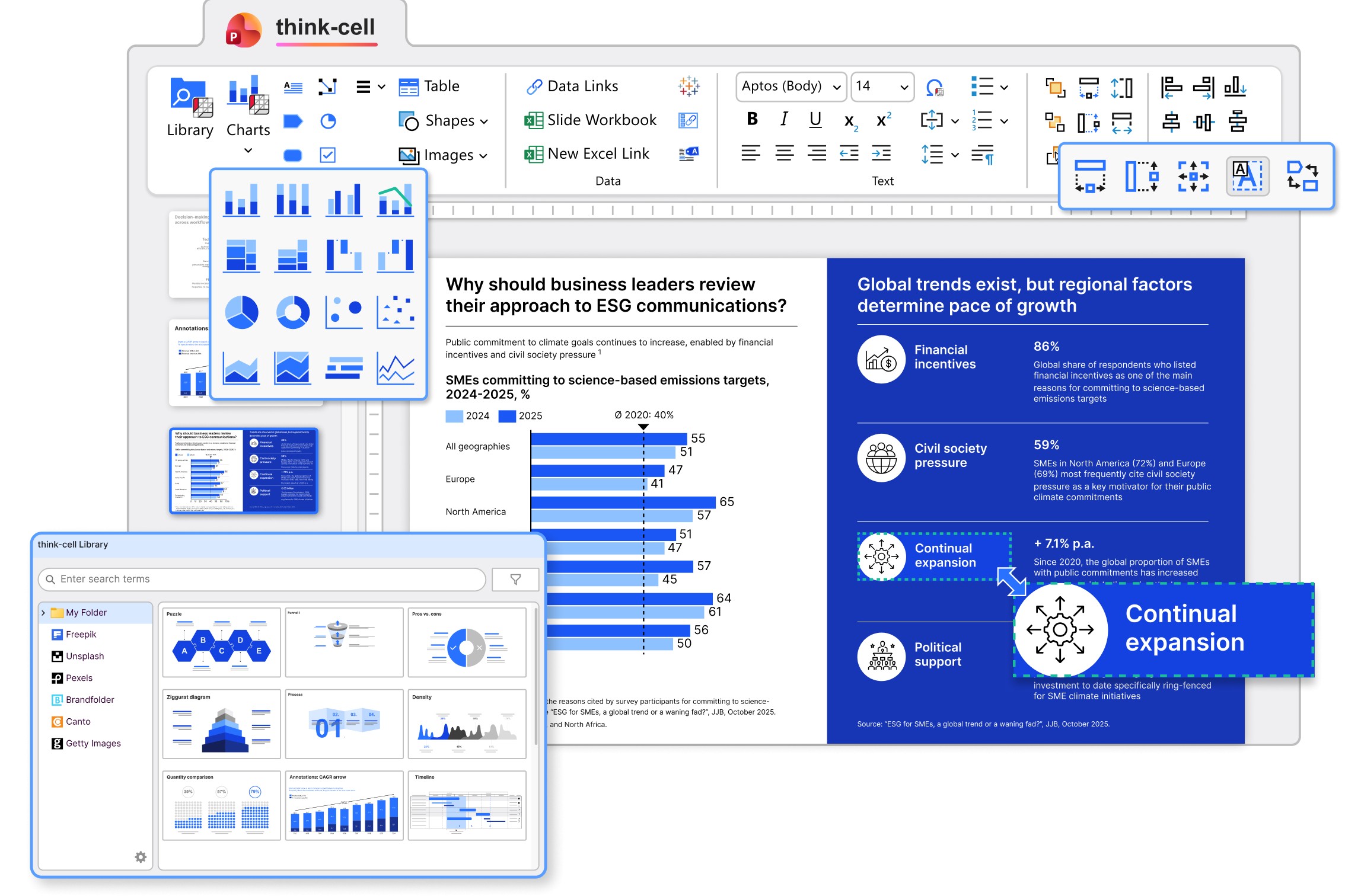 Acceda a plantillas, bibliotecas de imágenes, gráficos y herramientas desde una única pestaña think-cell para crear presentaciones de forma más efectiva.