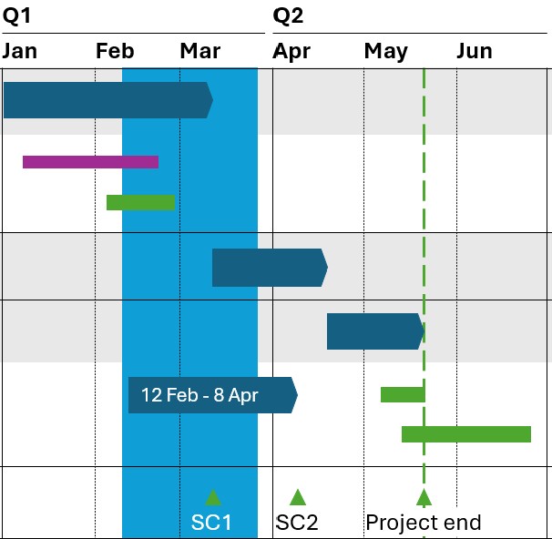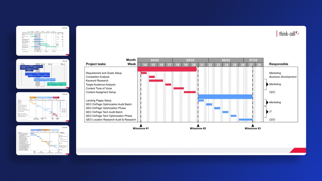 Con la funzione diagramma di Gantt di think-cell puoi creare rapidamente ed efficientemente diagrammi di Gantt professionali in PowerPoint.