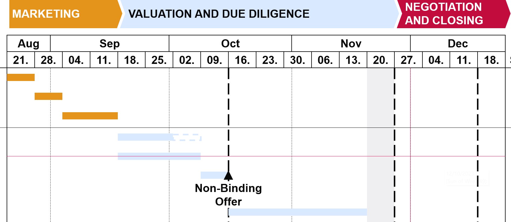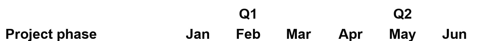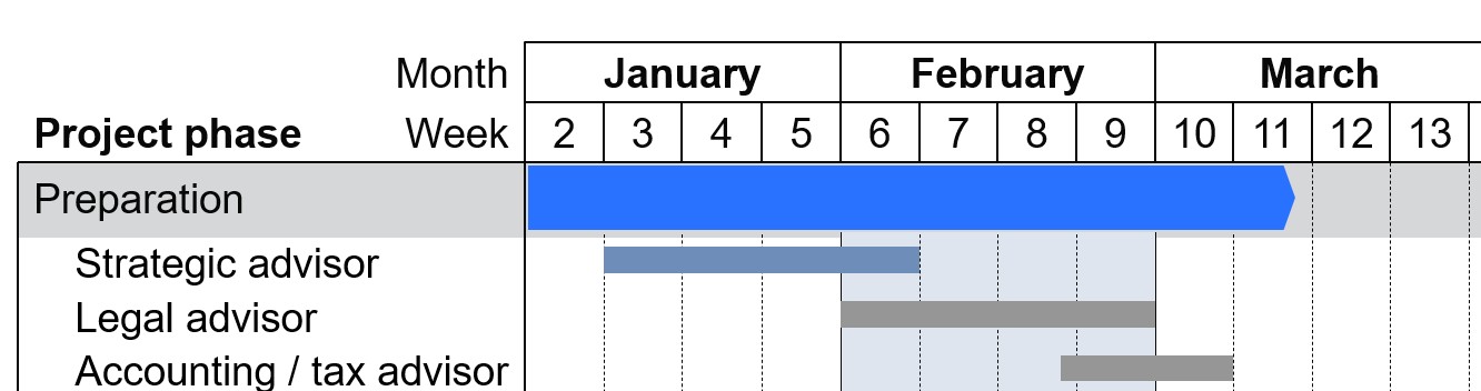 Nei template di diagrammi di Gantt disponibili in think-cell Library, le dimensioni predefinite del font vanno da 12 a 14. Questo intervallo funziona nella maggior parte dei casi, ma dovresti adattarlo se ci sono problemi di leggibilità.