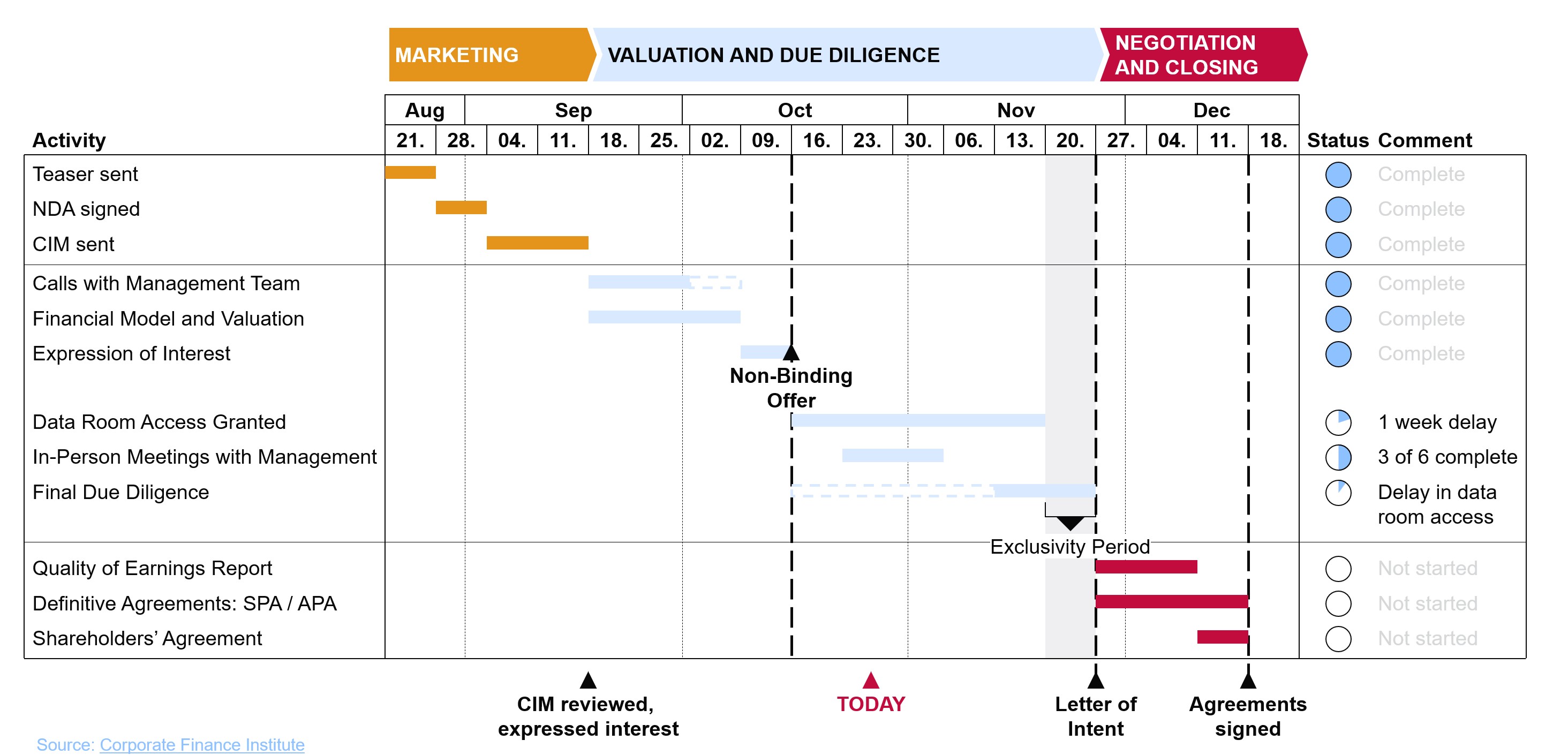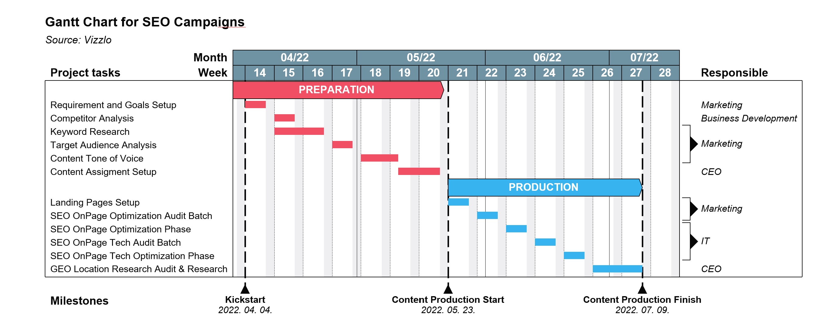 I marcatori, come rombi o triangoli, mostrano le milestone principali del progetto.