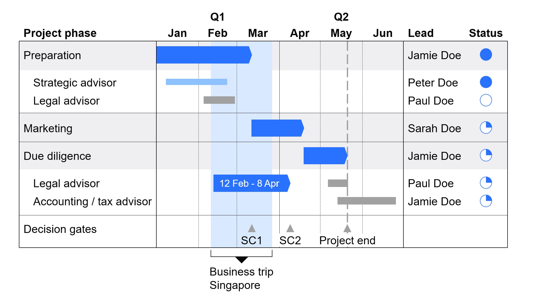 Se usi regolarmente i diagrammi di Gantt, vale la pena creare un template da riutilizzare ogni volta: ti aiuterà a farlo riconoscere più facilmente dai tuoi stakeholder. Puoi partire da uno di questi template gratuiti di think-cell.