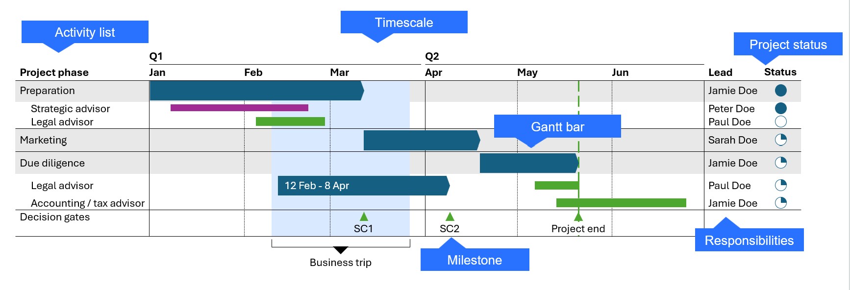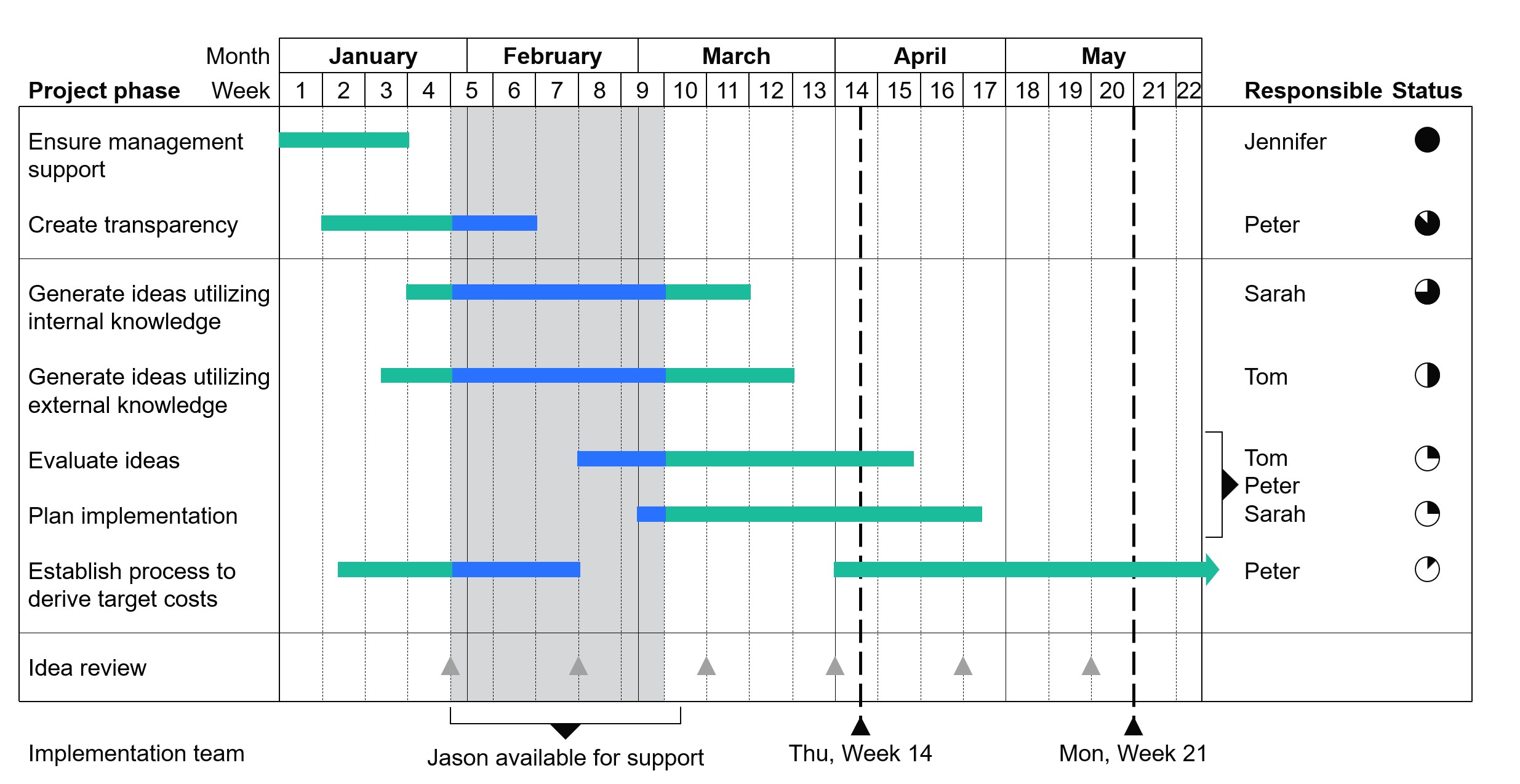 L’area all’estrema destra del diagramma viene di solito usata per indicare il responsabile di ogni attività. L’avanzamento dell’attività può essere rappresentato con una Harvey ball, una casella di spunta o una percentuale.
