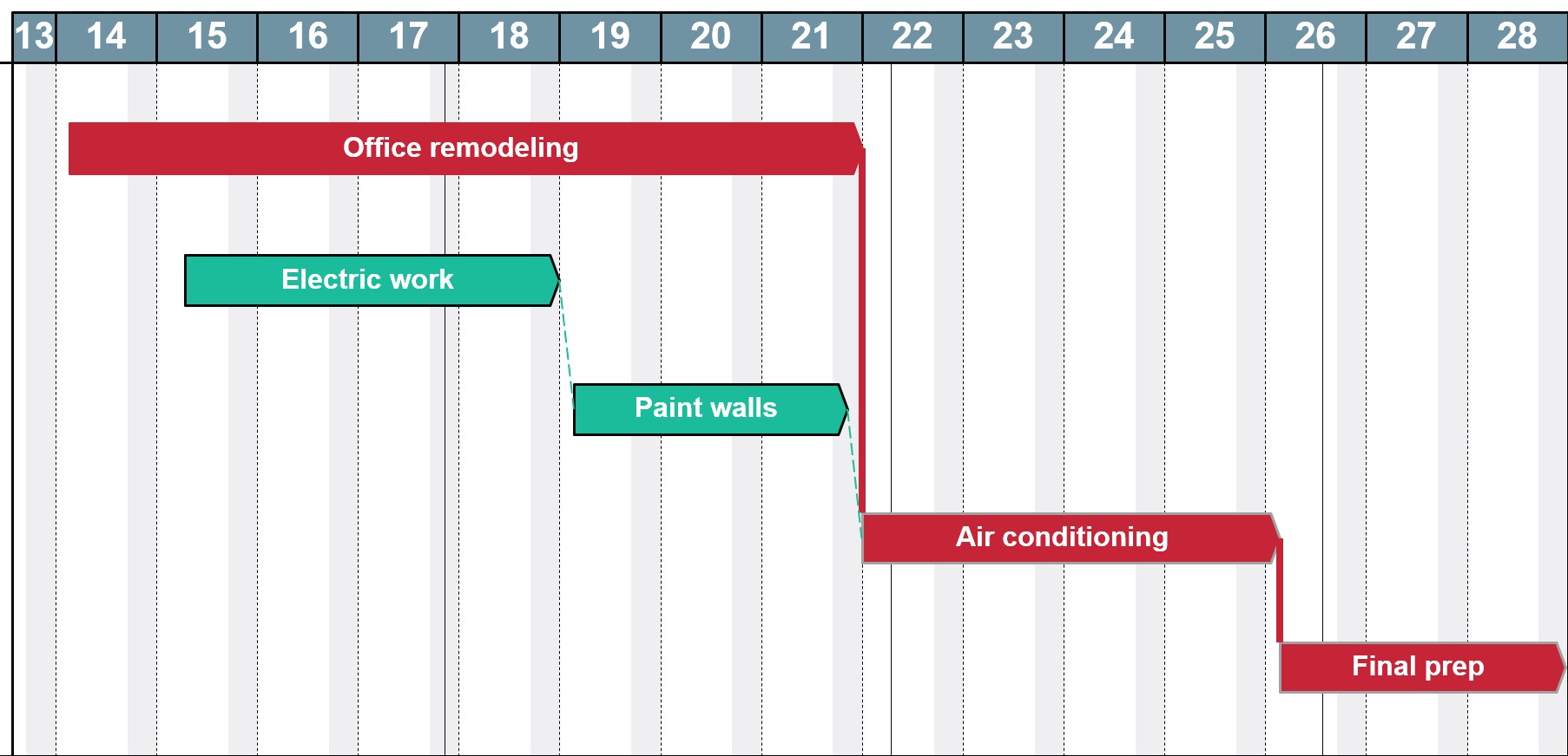 Le dipendenze sono rappresentate visivamente da frecce che collegano le barre e ne esistono quattro tipi principali.