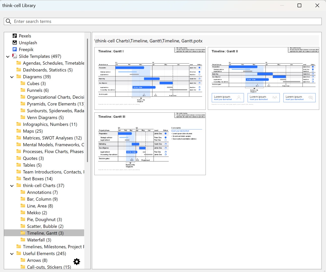- Se vuoi scegliere tra diversi template di diagrammi di Gantt, seleziona Library nella scheda think-cell in PowerPoint.