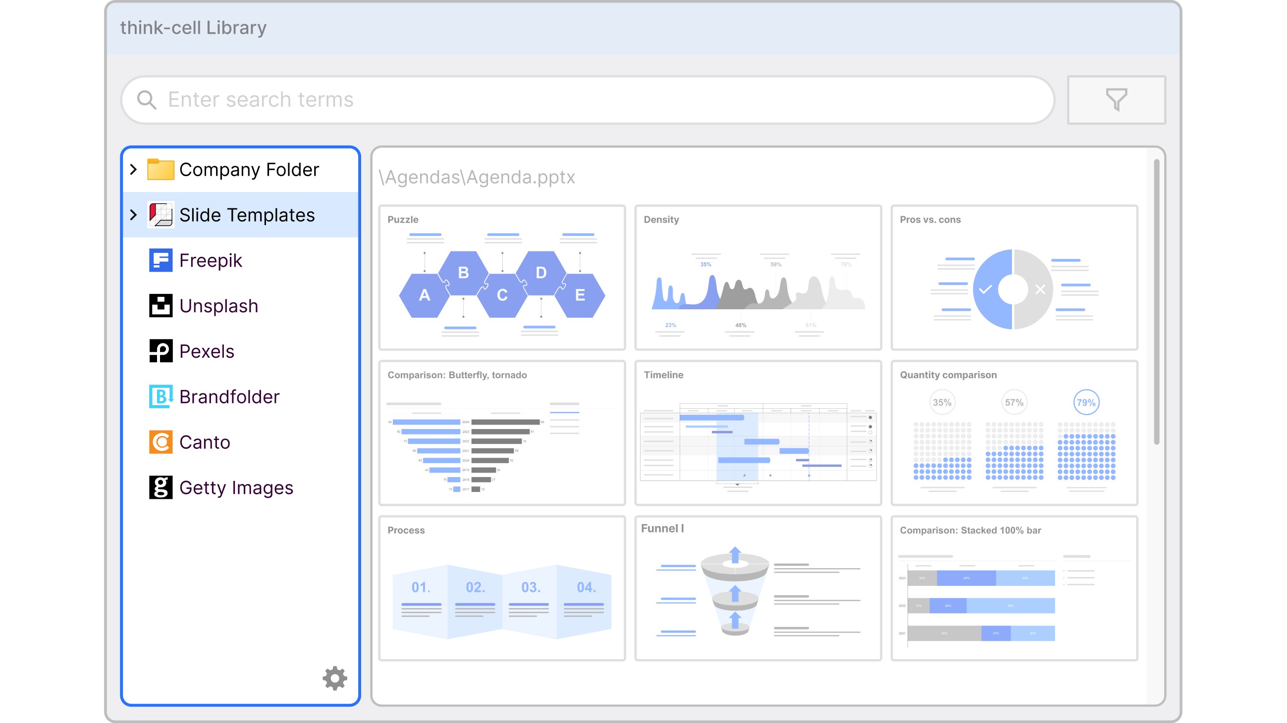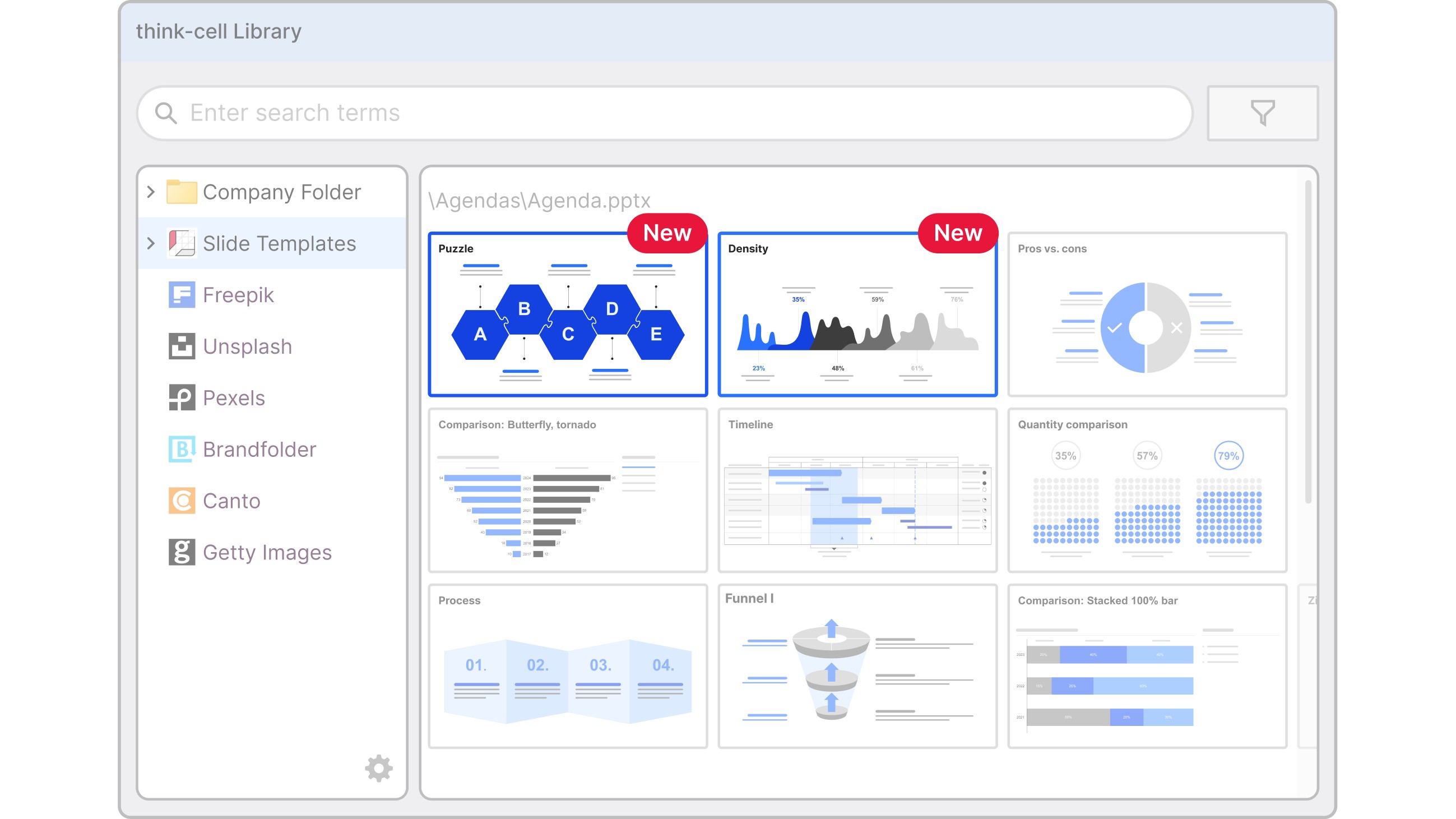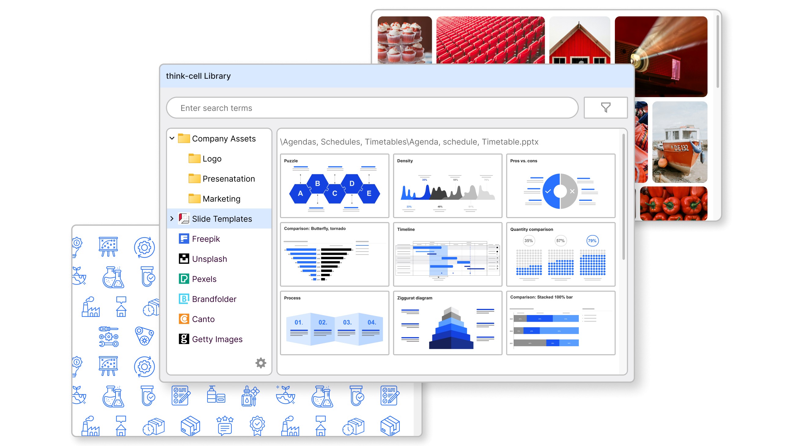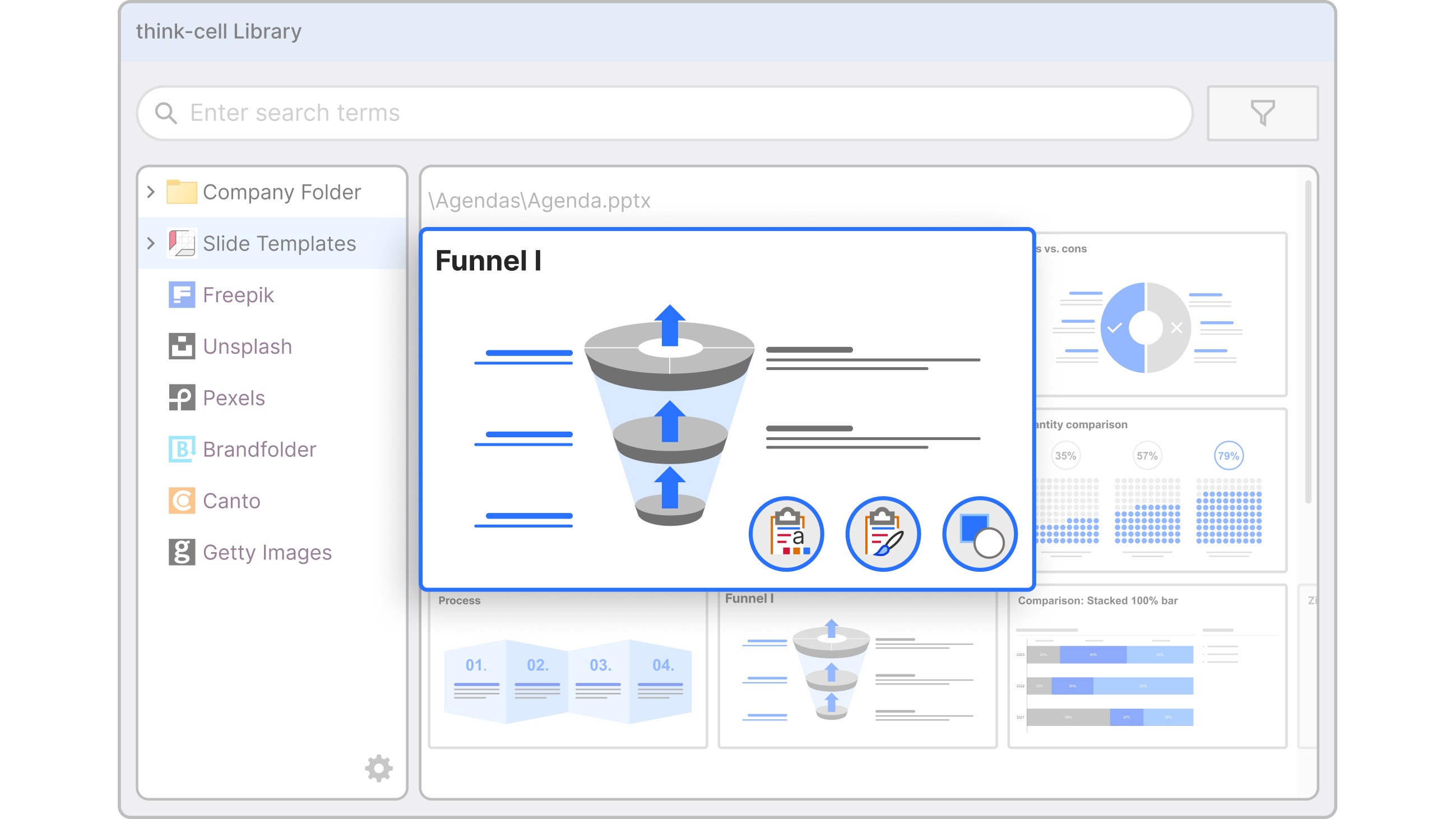 O think-cell Library permite adicionar apresentações, slides, modelos, imagens e ícones favoritos, inserindo tudo exatamente onde você precisa.