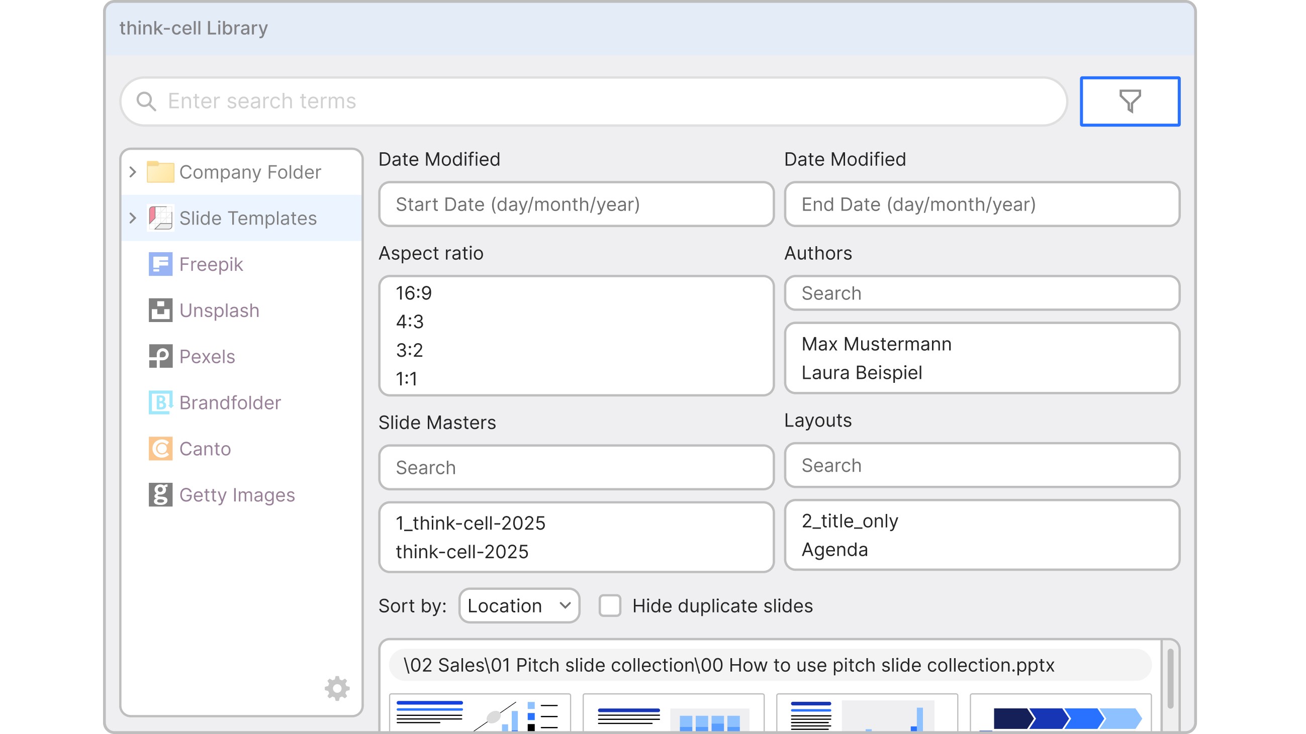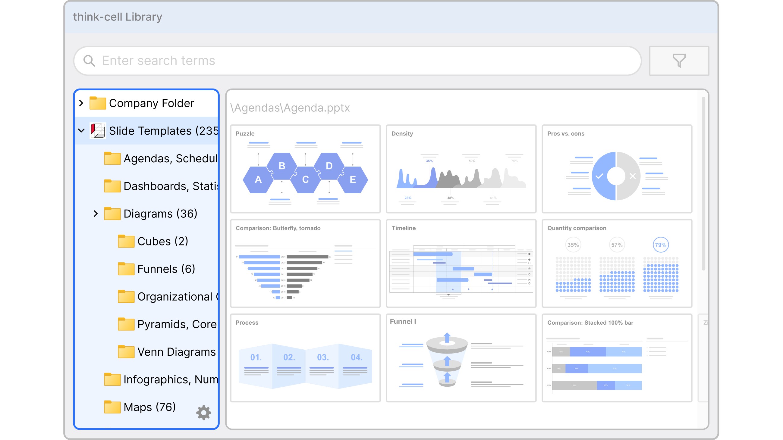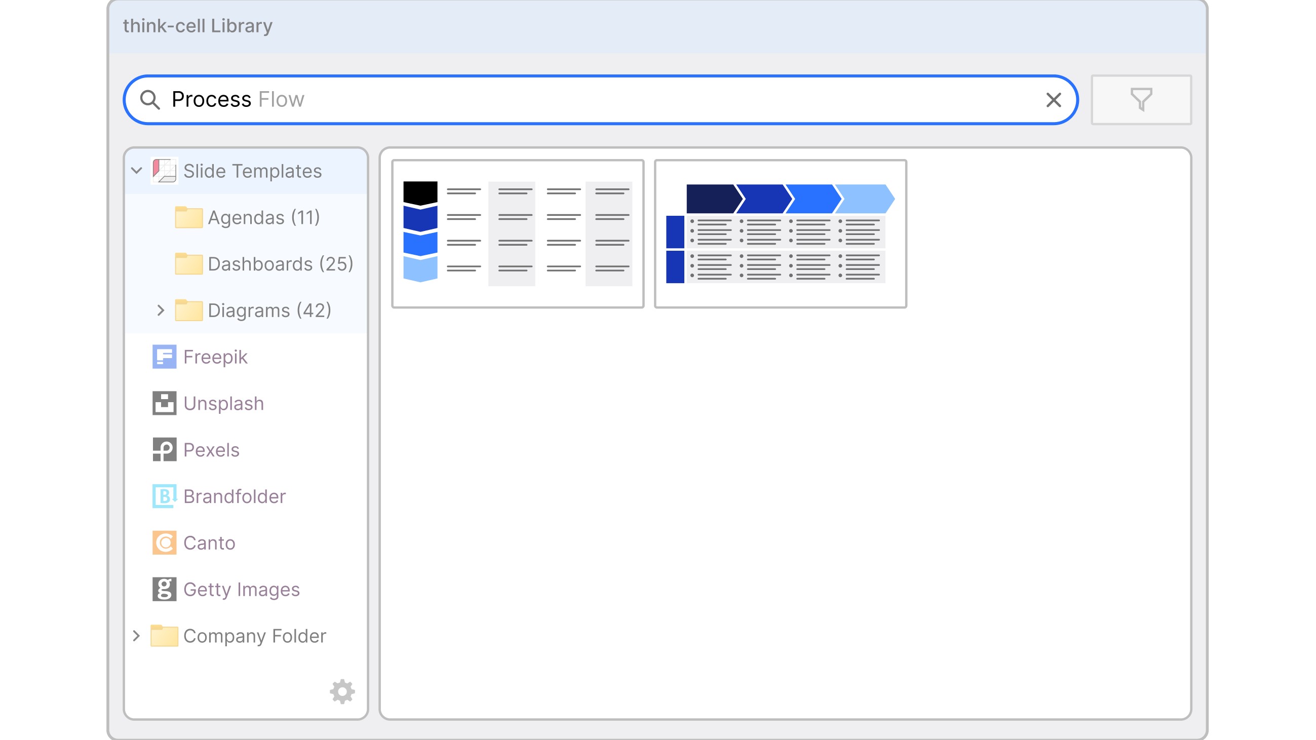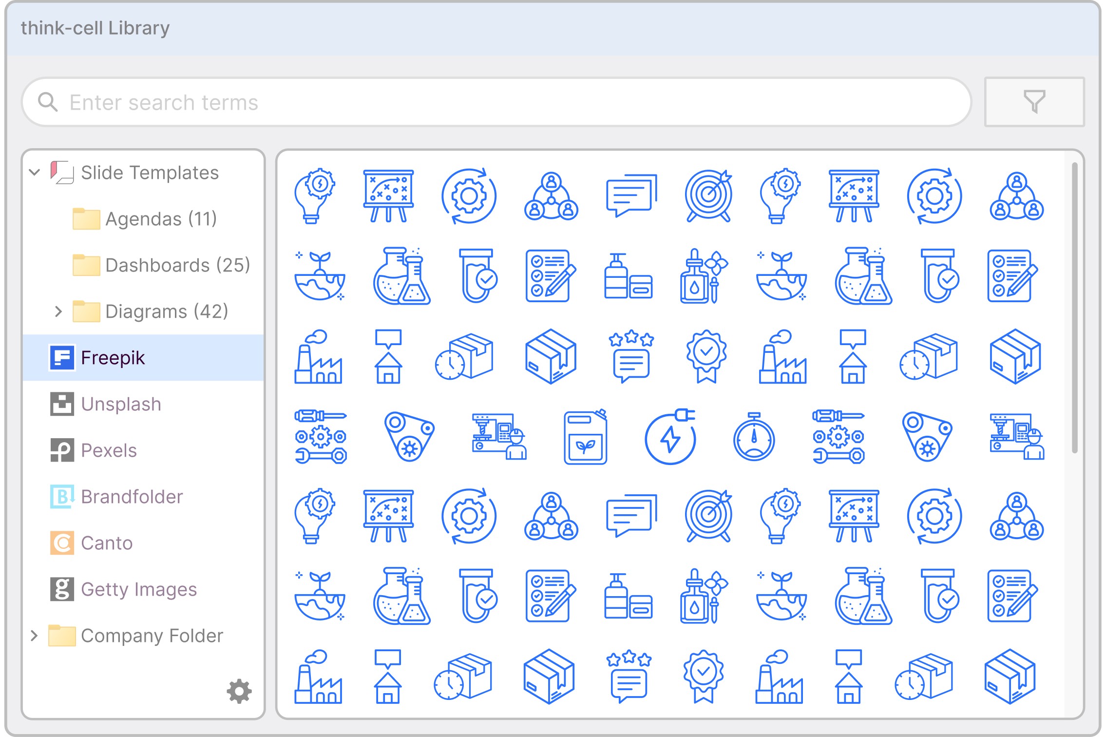O think-cell Library permite adicionar apresentações, slides, modelos, imagens e ícones favoritos, inserindo tudo exatamente onde você precisa.