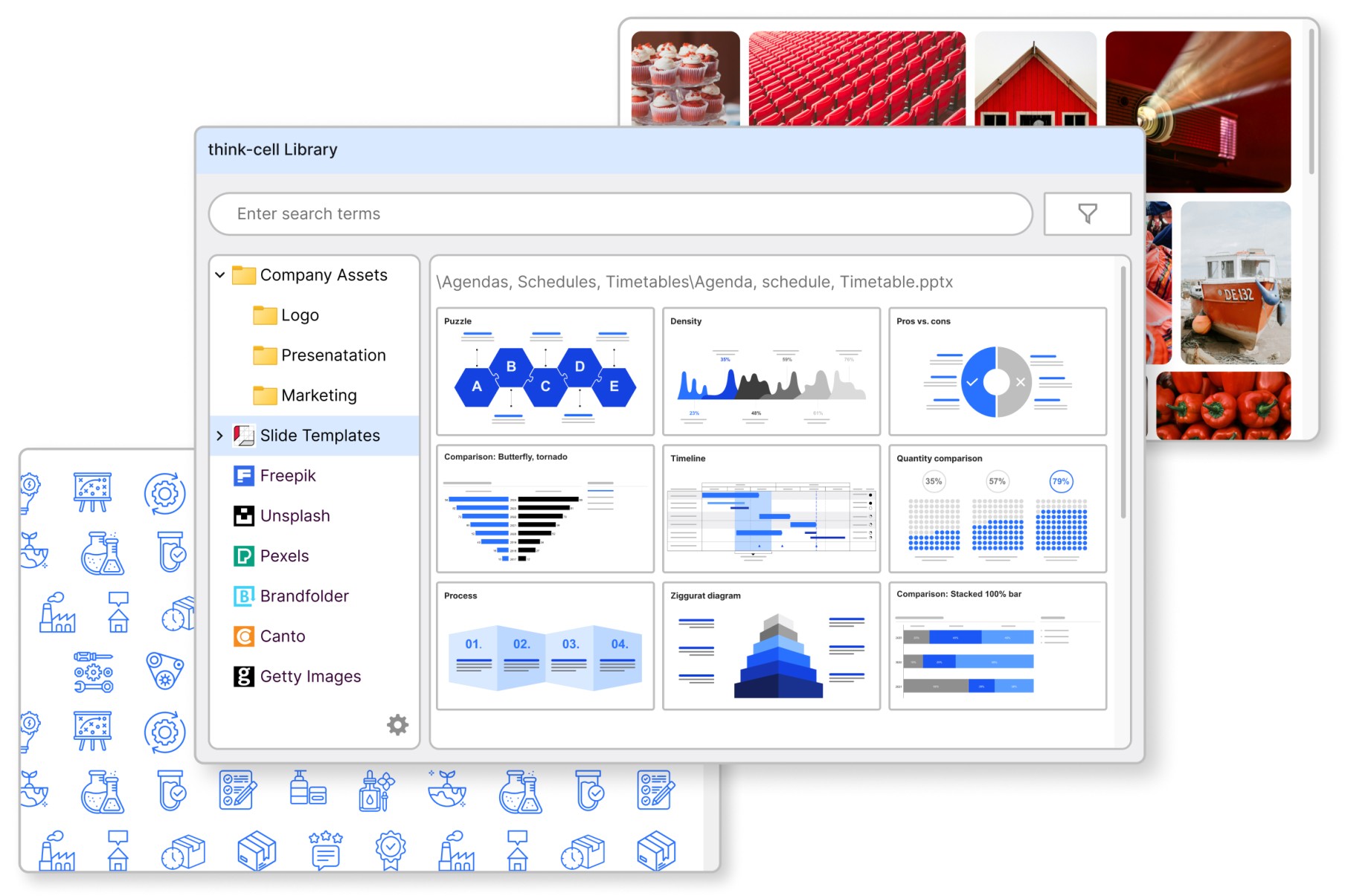 O think-cell Library permite adicionar apresentações, slides, modelos, imagens e ícones favoritos, inserindo tudo do que você precisa exatamente onde é necessário.