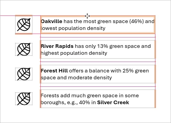 Alinhe os objetos uns com os outros ou com o slide. Para alinhar objetos, selecione os objetos e, em seguida, selecione think-cell > Layout > Align ou Shape Format > Arrange > Align e selecione como deseja alinhá-los: